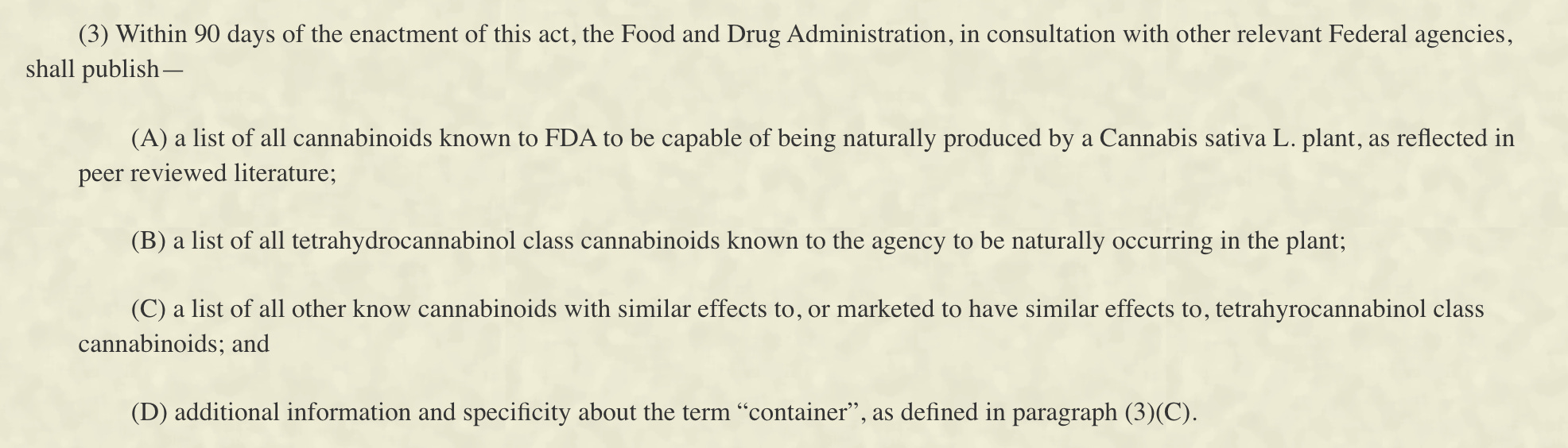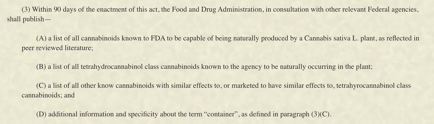 The bill gives the FDA 90 days to publish an official list of cannabinoids.