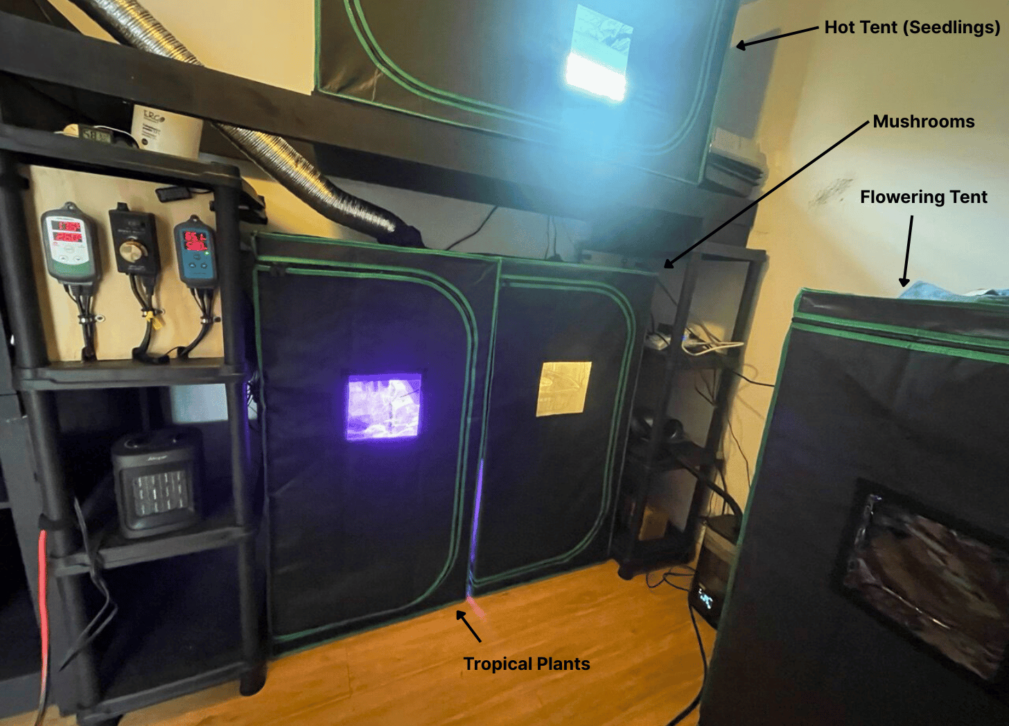 If youβre growing mushrooms or tropical plants like salvia or ayahuasca, youβll need to dial in the humidity. I use a reptile fogger with an extension hose to maintain moisture levels near 100% inside the tent.